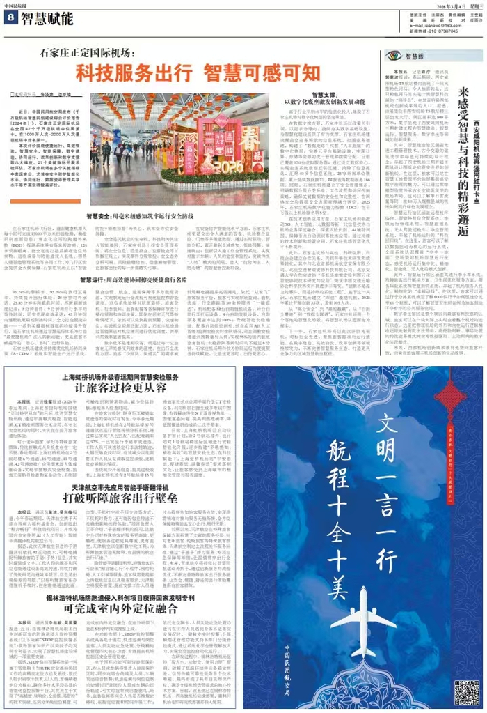 数字化不是堆砌设备,而是让每一位旅客在无声处感受到效率的温度。在出行全流程方面,旅客“少排队、快通关”的需求被机场精准捕捉并高效满足。依托“从家飞”旅客服务平台,旅客可实现航班查询、值机选座、行李跟踪等50余种服务“一键直达”;机场配备32台自助值机设备、10台自助行李托运设备、4台自助登机设备,自助服务覆盖率达到100%;升级智能安检通道,配备自助验证闸机,试点应用AI(人工智能)监测安检实时排队情况,动态调整安检通道开放数量与人员,实现95%的国内航班旅客值机、安检排队等候时间均不超过8分钟。石家庄机场用科技为协同运行与便捷服务持续赋能,让旅途更省时、出行更省心。