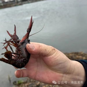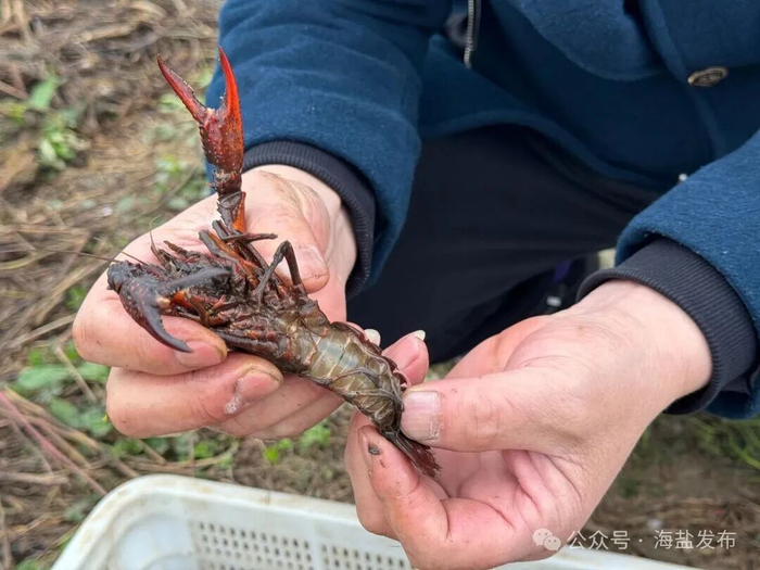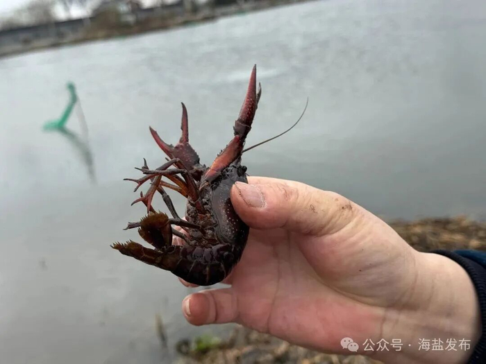近日,在海盐望海街道建黎家庭农场,只见工人们将一个个沉甸甸的网笼从水中提起,里面全是体形饱满、通体黑红、活蹦乱跳的越冬小龙虾。