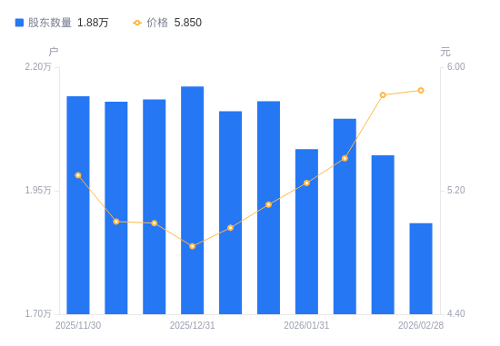 近一年(2025年2月28日至2026年2月28日),同德化工A股股东户数从1.72万户,增加至1.88万户,增幅9.29%,区间股价上涨14.04%。