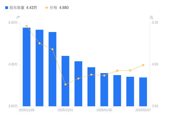 近一年(2025年2月28日至2026年2月27日),ST福能A股股东户数从7.99万户,减低至4.43万户,降幅44.57%,区间股价下跌34.58%。