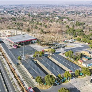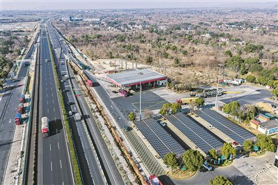 2026年1月7日拍摄的G50沪渝高速长兴服务区(无人机照片)。太阳能光伏板下是升级完成的高速服务区充电站。 新华/传真