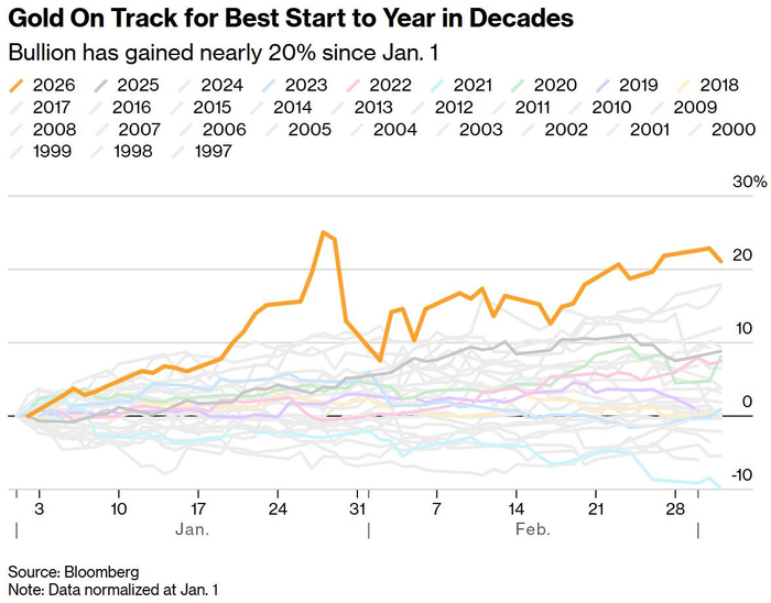 金价今年已上涨了约五分之一——并在1月下旬创下每盎司5,595美元以上的历史新高——持续的紧张地缘政治和贸易局势以及对美联储独立性的担忧支撑了需求。