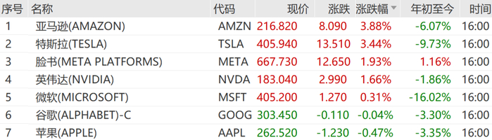 亚马逊涨3.88%,特斯拉涨3.44%,脸书涨1.93%,领涨科技七巨头。