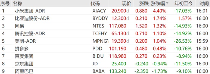 小米集团涨4.40%,比亚迪涨1.74%,网易涨1.32%,领涨万得中概科技龙头指数成份股。