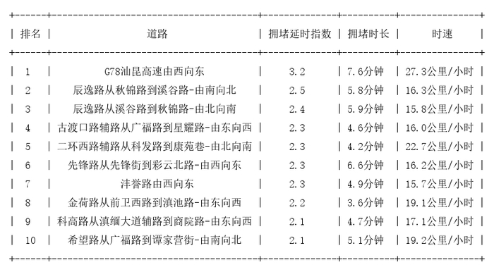 昆明道路拥堵排行榜top10: