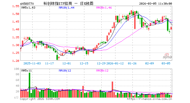 3月5日,截止午间收盘,科创综指ETF招商(589770)涨2.02%,报1.412元,成交额966.68万元。科创综指ETF招商(589770)重仓股方面,寒武纪截止午盘涨4.88%,海光信息涨2.68%,中芯国际涨1.12%,中微公司涨3.08%,金山办公涨0.21%,澜起科技涨2.40%,百利天恒涨4.35%,联影医疗涨0.20%,影石创新涨2.75%,拓荆科技涨2.27%。