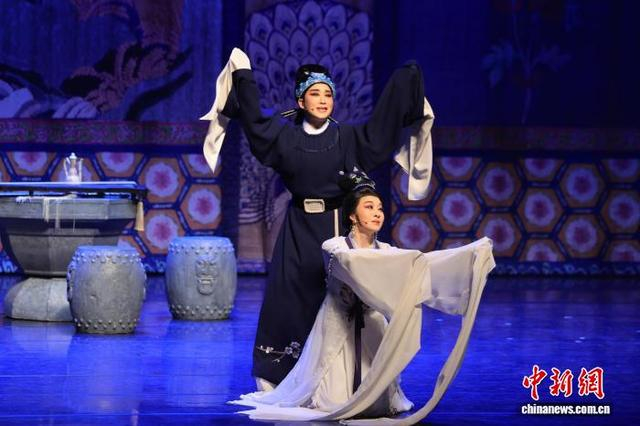 2月27日晚,蔡浙飞(黑色服饰)主演的《陆游与唐琬·题诗壁》在台湾演出现场。(浙江小百花越剧院供图)