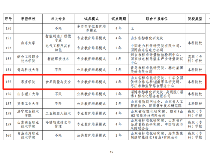 山东省枣庄市“食品质量与安全专业”入选国家级专业与标准化教育融合试点名单