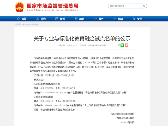 中国质量新闻网讯 为深入贯彻《国家标准化发展纲要》和《教育强国建设规划纲要(2024—2035年)》,加快培养兼具专业能力与标准化素养的复合型人才,近日,国家市场监督管理总局、教育部联合发布《关于专业与标准化教育融合试点名单的公示》,枣庄市市场监管综合服务中心联合枣庄学院等单位申报的“食品质量与安全专业”入选。