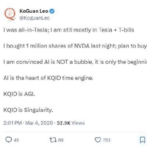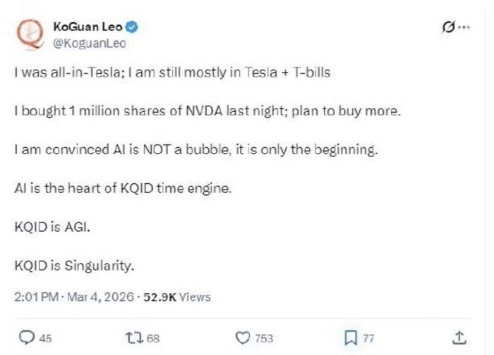 当地时间3月4日,华裔富豪廖凯原(Leo KoGuan)在社交平台上宣布,已买入100万股英伟达股票。英伟达周二在纽约收于180.05美元,这意味着其耗资约1.8亿美元。他在其个人账号上写道:“我坚信人工智能没有泡沫,它才刚刚起步。”