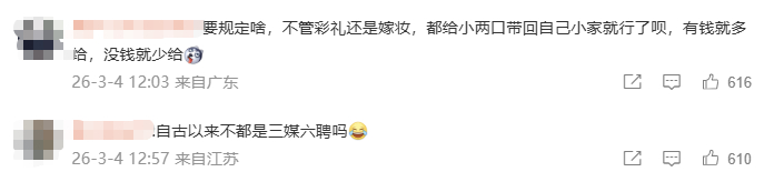 今年2月发布的中央一号文件提到,“持续整治农村高额彩礼,加强省际毗邻地区联动治理。引导树立正确的婚恋观、生育观、家庭观,培育简约文明的婚俗文化。”2026年全国两会,“高额彩礼”问题也成为代表们关注的一项社会议题。