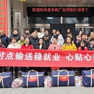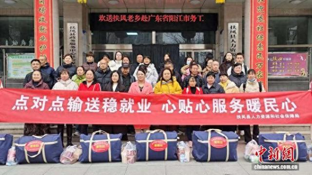 3月4日,陕西扶风多名务工人员临行前合影,随后登上“扶风—广东”免费返岗务工直通车,开启新一年的务工生活。(陕西省人社厅供图)