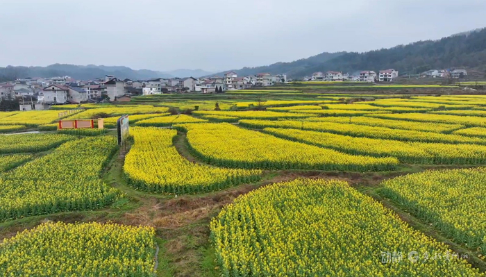 走进油菜种植基地,金黄花瓣层层舒展,随风轻舞。蜜蜂在花间穿梭采蜜,阵阵清香沁人心脾。俯瞰之下,金色花海与青山、碧水、村寨、田园相互映衬,勾勒出一幅灵动的春日画卷。游客纷至沓来,漫步赏景、拍照留念。
