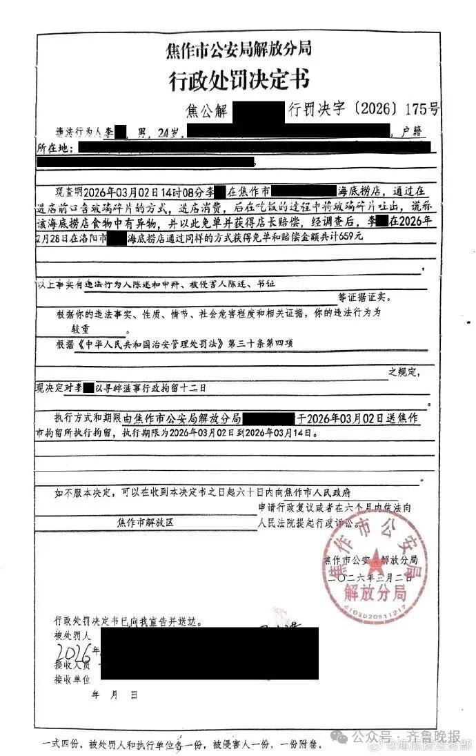 24岁男子口含玻璃碎片“碰瓷”海底捞,被行拘12日!吃饭过程中吐出,谎称食物中有异物,以此免单获赔
