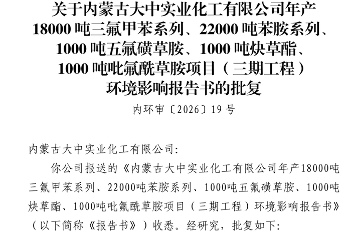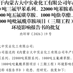近日,关于关于内蒙古大中实业化工有限公司年产18000吨三氟甲苯系列、22000吨苯胺系列、1000吨五氟磺草胺、1000吨炔草酯、1000吨吡氟酰草胺项目(三期工程)批复公示。