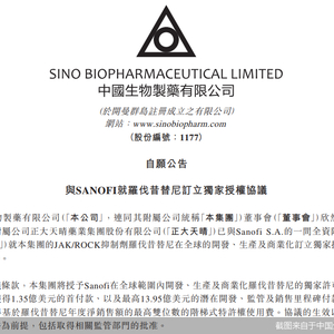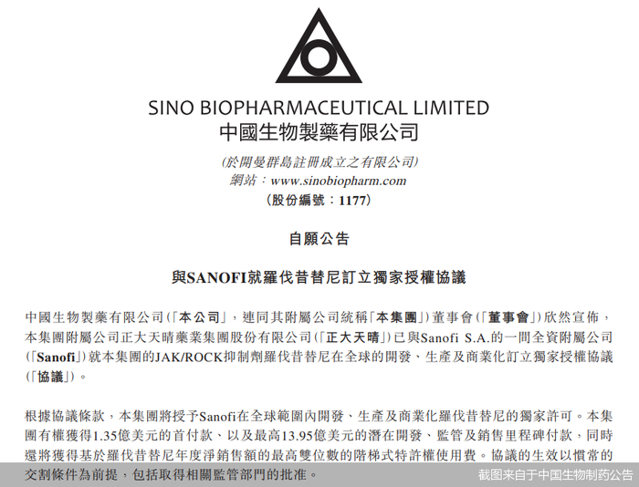 此次引发广泛关注的交易源于前一日的一则公告。3月4日,中国生物制药宣布,公司附属公司正大天晴药业集团股份有限公司(以下简称“正大天晴”)已与赛诺菲(Sanofi S.A.)的一家全资附属公司Sanofi就JAK/ROCK抑制剂罗伐昔替尼在全球的开发、生产及商业化签订独家授权协议。