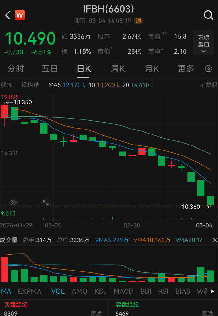 3月5日上午,IFBH股价高开14.97%,盘中股价最高触及15.77港元,资金明显回流。