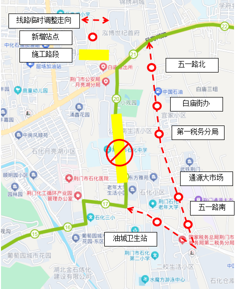 临时调整走向:月亮湖路—五一路—白庙路
