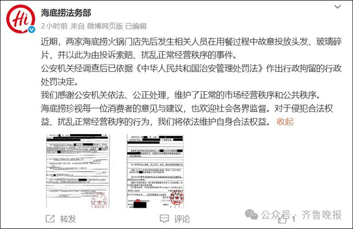 今天,@海底捞法务部 发布消息,称近期两家海底捞火锅门店先后发生相关人员在用餐过程中故意投放头发、玻璃碎片,并以此为由投诉索赔、扰乱正常经营秩序的事件。