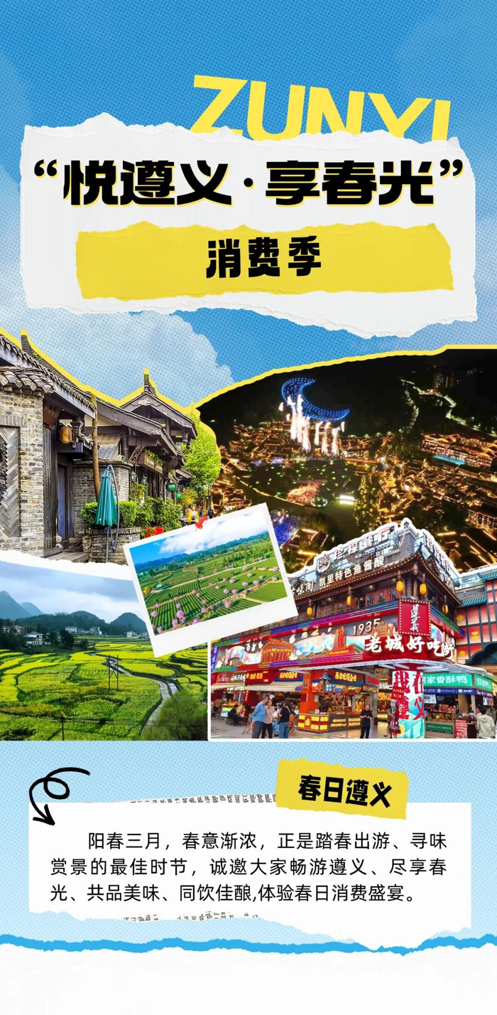据了解,这个春季,遵义市商务系统紧扣大众“春游”消费习惯,整合全市商业载体、特色餐饮和优质白酒,推出一批春季消费场景和系列惠民让利政策,让城市更有烟火气、消费更有获得感、生活更有仪式感,以此推动消费市场持续升温,描绘出一幅“春满遵义、活力全开”的高质量发展新画卷。