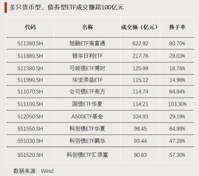 短融ETF海富通今日成交额达622.92亿元,在ETF市场排名第一。银华日利ETF、可转债ETF博时、华宝添益ETF等成交额也超过100亿元。