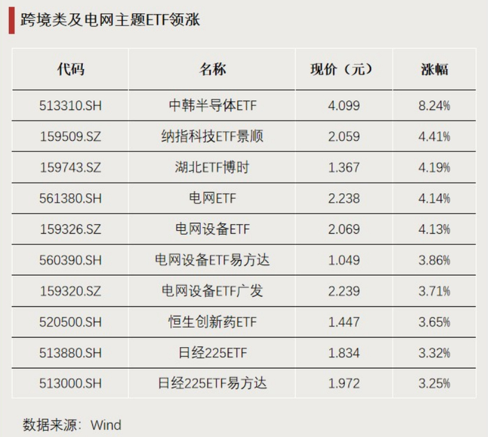 3月5日,A股市场企稳回升,个股全线飘红。本周以来表现活跃的电网设备板块再度领涨,多只跨境类ETF也跟随外围股市走强。此外,受港股创新药板块强势表现推动,今日港股创新药主题ETF表现不俗,多个ETF品种涨幅超3%。