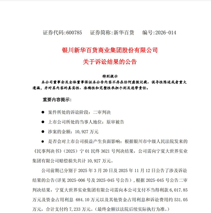 3月5日盘后,新华百货(SH600785)公告称已于当日收到银川市中级人民法院(以下简称银川中院)发来的二审《民事判决书》。终审判决显示,法院判决新华百货在判决生效30日内,赔偿大世界损失共计1.09亿元,并承担其他诉讼费用。