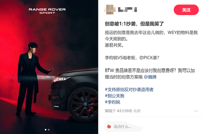 长城汽车旗下魏牌广告海报发布后被原创意作者发现。