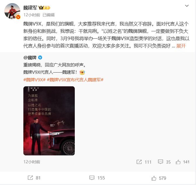 魏牌V9X可是被魏建军寄予厚望,号称是他们的旗舰,并且此次老板亲自代言,重视程度不言而喻。
