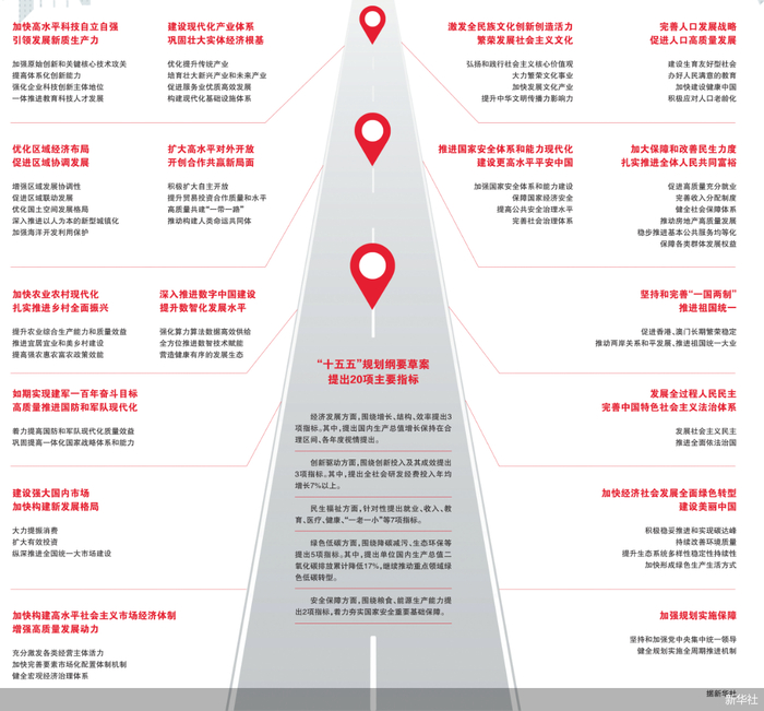 草案提出,“十五五”时期经济社会发展要实现以下目标:高质量发展取得显著成效,科技自立自强水平大幅提高,进一步全面深化改革取得新突破,社会文明程度明显提升,人民生活品质不断提高,美丽中国建设取得新的重大进展,国家安全屏障更加巩固。