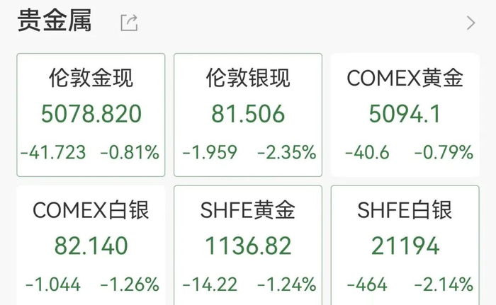 3月5日晚,贵金属价格全线下跌,现货黄金跌近1%跌破5100美元,现报5078美元/盎司。现货白银跳水,一度跌超3%,截至发稿白银跌超2%。