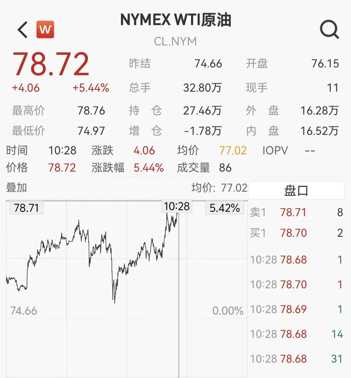 3月5日晚,WTI原油期货涨幅扩大超5%,刷新去年1月以来高位,报78.2美元/桶。