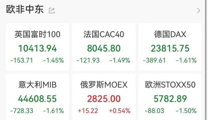 美东时间周四,欧美股市集体收跌,欧洲三大股指、道指均跌超1%,其中道指日内下挫超780点,标普500指数、纳指小幅下跌。国际原油猛涨,其中WTI原油涨超5.6%。