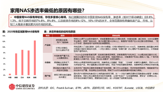 家用NAS的价值、优势与渗透率瓶颈:NAS的家庭用途占比20%,其核心价值在于解决家庭数据分散、存储焦虑、隐私安全三大痛点,其应用场景已从单一的文件存储,拓展为四大核心场景,形成完整的家庭数字基础设施能力,其核心优势在于数据隐私安全、成本效益显著、功能扩展丰富等,因此具有移动硬盘和公有网盘无法替代的综合价值。但是报告测算2025年中国家用NAS保有率、渗透率(相对于移动硬盘)仅0.6%、1.3%,我们认为全球范围保有率偏低是产品、市场、认知三大维度多重因素共同作用的结果。