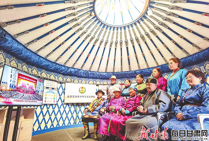 3月5日,肃南裕固族自治县群众收看第十四届全国人民代表大会第四次会议开幕会实况。 新甘肃·甘肃日报通讯员 王将