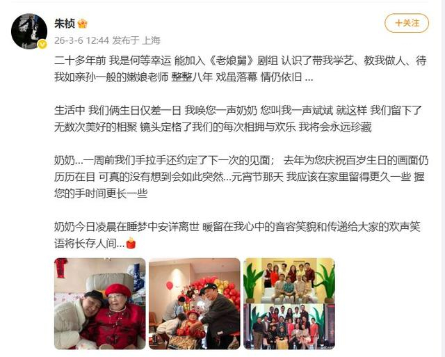 主持人朱桢刚刚发布微博:“二十多年前,我是何等幸运,能加入《老娘舅》剧组,认识了带我学艺、教我做人、待我如亲孙一般的嫩娘老师,整整八年,戏虽落幕,情仍依旧 …”他还表示“一周前我们手拉手还约定了下一次的见面;去年为您庆祝百岁生日的画面仍历历在目,可真的没有想到会如此突然…元宵节那天 我应该在家里留得更久一些,握您的手时间更长一些”