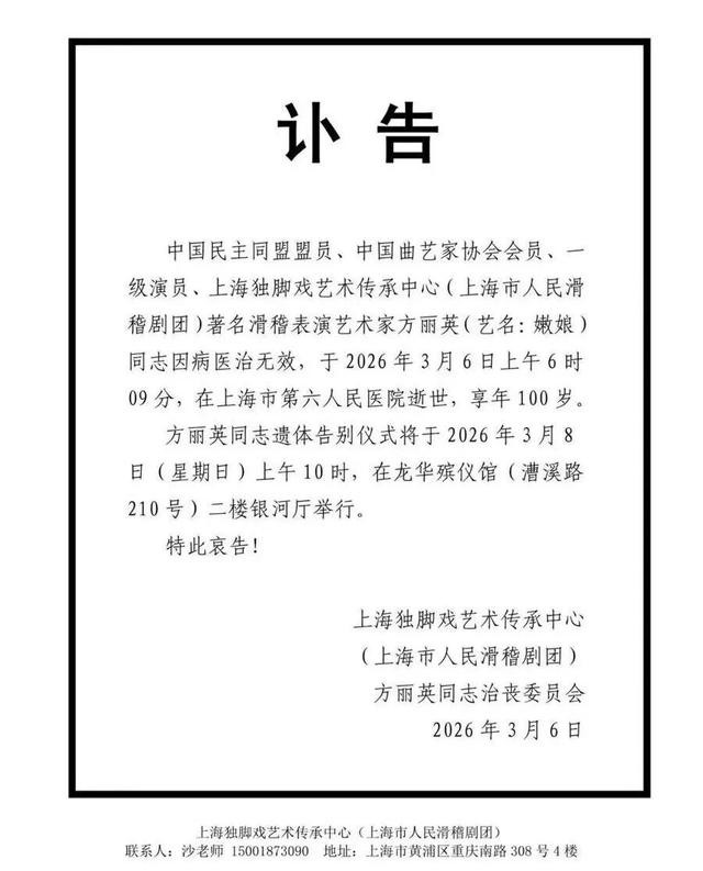 记者从上海独脚戏艺术传承中心(上海市人民滑稽剧团)获悉,中国民主同盟盟员、中国曲艺家协会会员、一级演员、著名滑稽表演艺术家方丽英(艺名:嫩娘)因病医治无效,于2026年3月6日上午6时09分,在上海市第六人民医院逝世,享年100岁。