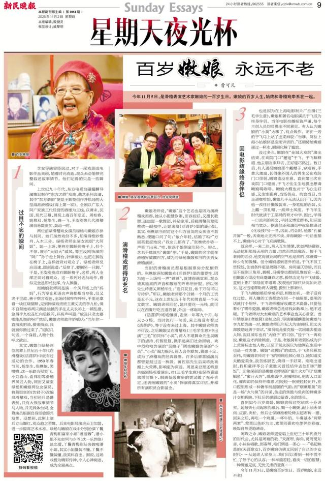 2025年12月31日,嫩娘以百岁高龄现身大宁剧院,登上《名尚之夜:万马奔腾贺新岁——第三届滑稽跨年晚会》舞台,为全场观众送上新年祝福,亲切问候引爆全场掌声,成为当晚最温暖的高光时刻。在后台化妆间,她仍与后辈笑谈艺术、相约来年再登台。遗憾的是,这竟是她留给观众最后的舞台身影。