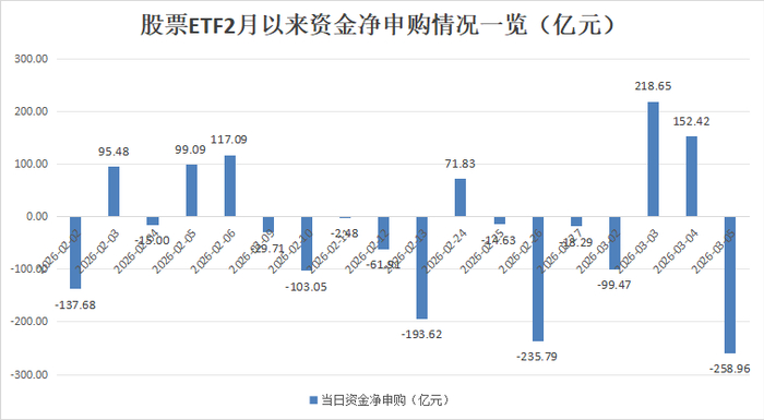 银河证券基金研究中心数据显示,截至3月5日,全市场1347只股票ETF(含跨境ETF,下同)最新规模达到3.78万亿元,在昨日股市反弹行情中,股票ETF市场资金净流出金额达258.96亿元,这不仅是继2月26日之后,股票ETF市场再现200亿元级的资金净流出,也是自今年2月以来,股票ETF市场单日最大净流出。