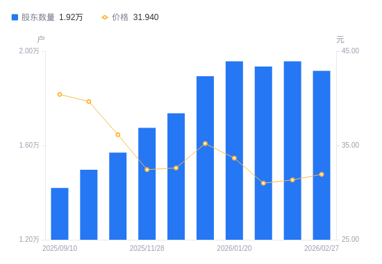 近一年(2025年2月28日至2026年2月27日),宸展光电A股股东户数从1.45万户,增加至1.92万户,增幅31.89%,区间股价下跌2.77%。