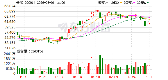3月6日,长和股价收涨0.65%,每股报61.55港元,总市值2357亿港元。