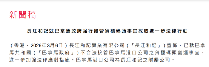 3月6日,李嘉诚旗下长江和记表示:就巴拿马政府强行接管货柜码头事宜采取进一步法律行动。