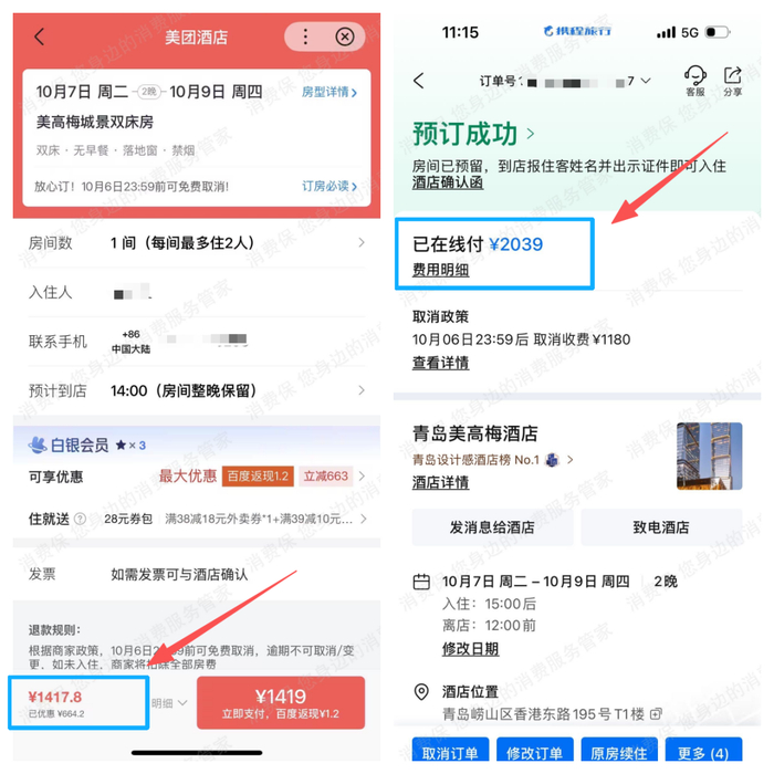 另一位消费者文女士同样遭遇“杀熟”:在携程以2038元预订青岛美高梅酒店2晚,却发现其他平台同日期同房型仅售1419元。当她要求退还619元差价时,携程平台仅同意补偿300元。