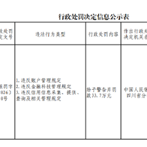 四川新网银行被罚33.7万元:违反账户管理规定等