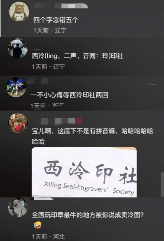 更令人哭笑不得的是,这位网友在纠正自己的第一印象时,又将“西泠(líng)印社”错读成了“西冷(lěng)印社”。