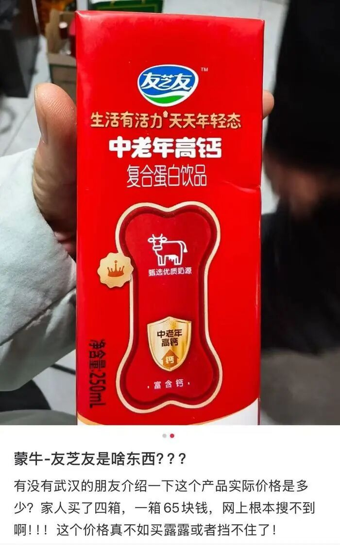 类似情况并非个案。记者调查发现,市面上流通的此类产品已经形成了多种包装版本。流通最广的一款采用白底绿字手提袋,左上角印有蒙牛标志,中央写着“高钙低脂牛奶”,而内盒则是友芝友的复合蛋白饮品。