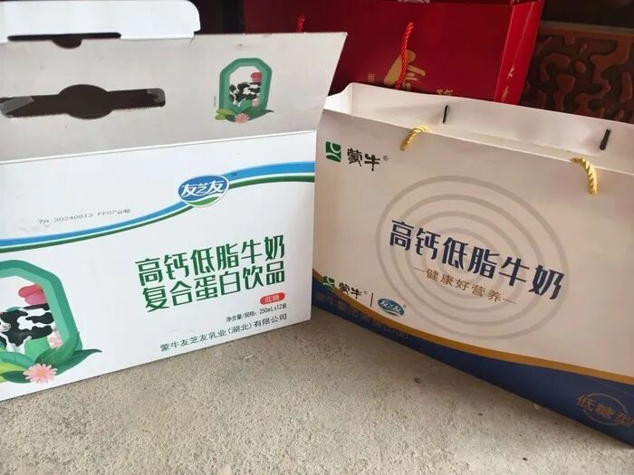 安徽宿州泗县的一名消费者向记者讲述了自己的购买经历。她表示,家人在超市挑选走亲访友的礼品时,看到一款印有“高钙低脂”的蒙牛礼盒,一箱足有20瓶,加上包装壳上显眼的牛奶字样,便直接付款拎走。