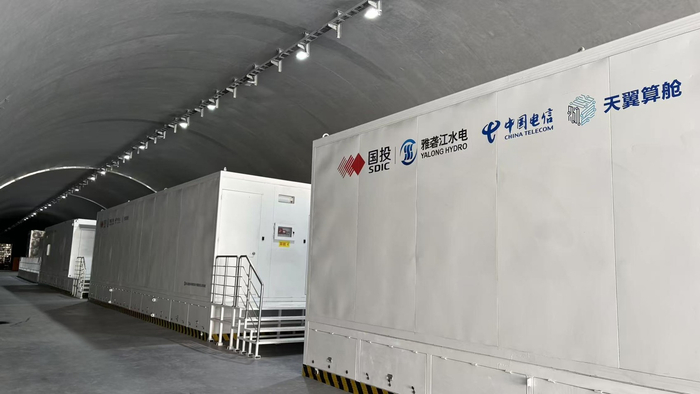 雅砻江两河口水电站的隧洞内,摆放着一连串算力舱。雅砻江公司两河口电厂常务副厂长、管理局副局长王文松介绍,这里相当于一个小型的超算中心,部署了2000张国产算力芯片,提供峰值算力约600PFLOPS(每秒浮点运算60亿亿次),相当于2.4亿台人们日常办公使用的台式计算机每秒的计算能力。