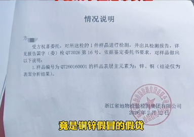 2月11日,方先生联系到“名富金银投资旗舰店”负责人,对方表示,建议方先生找专业检测机构检测。方先生询问,如果检测结果为假,是否退一赔三?该负责人表示可以。