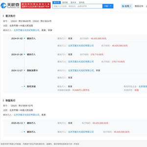 此外,董璇名下北京艺璇文化经纪有限公司现存一则恢复执行信息,执行标的4942万元,执行法院为北京市第一中级人民法院,涉及浙江唐德影视股份有限公司与北京艺璇文化经纪有限公司、高云翔相关演出合同纠纷案件。